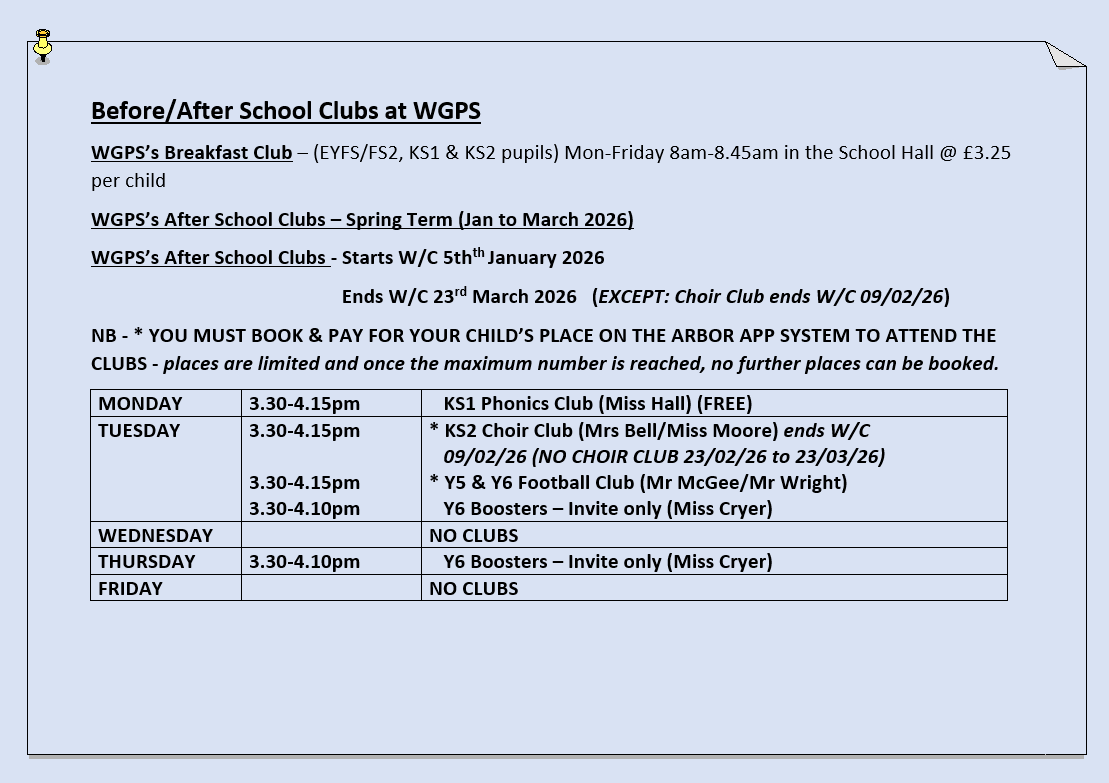 Below is our Spring Term (January to March 2026) After School Clubs