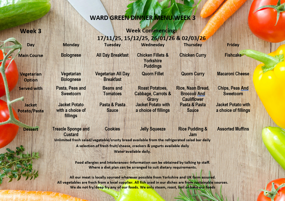 Dinners are £3.00 per meal per day, £15.00 per week.